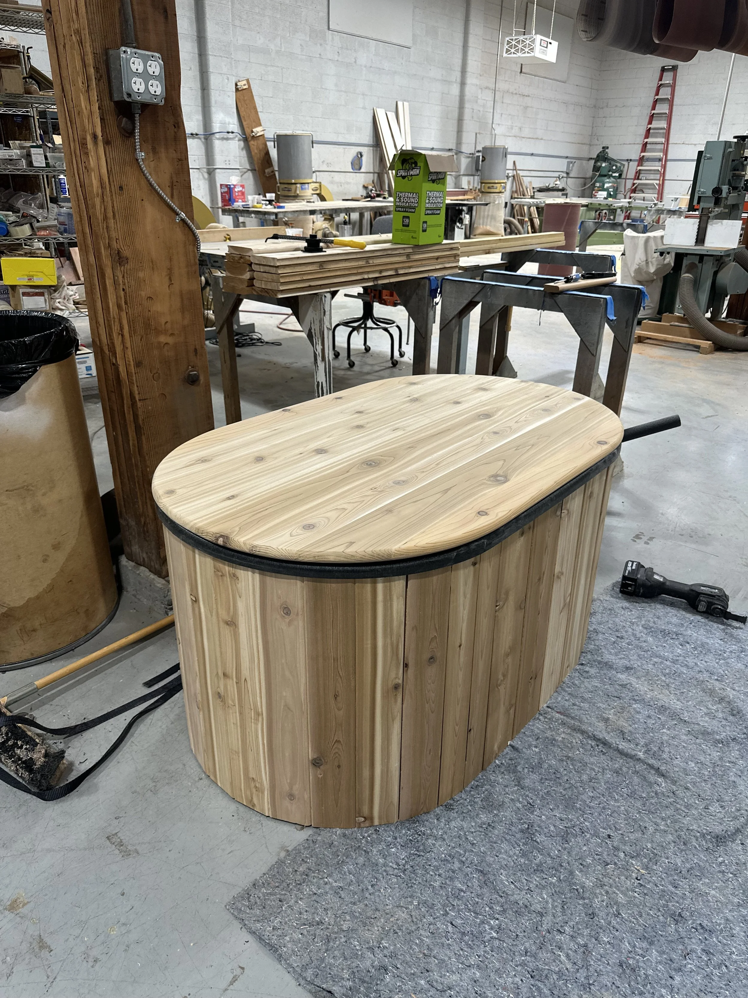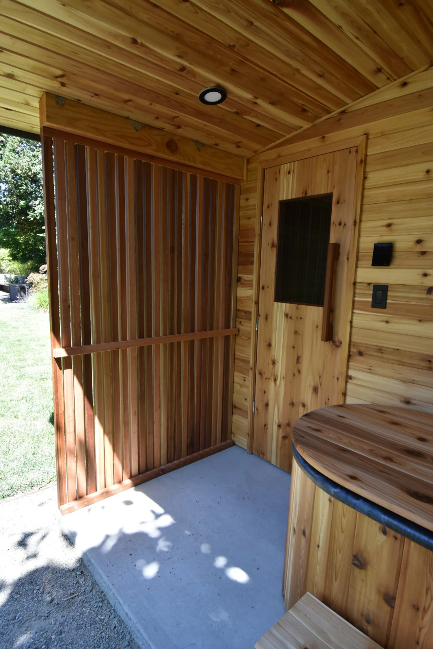 This custom 7’ x 8’ outdoor sauna was designed and built in the Rosewood neighborhood of NE Portland for a client who prioritized privacy, clean design, and performance. The project includes a cedar-lined 4’ x 8’ covered deck and a cold plunge setup, all built on a concrete slab with integrated floor drainage for year-round usability.