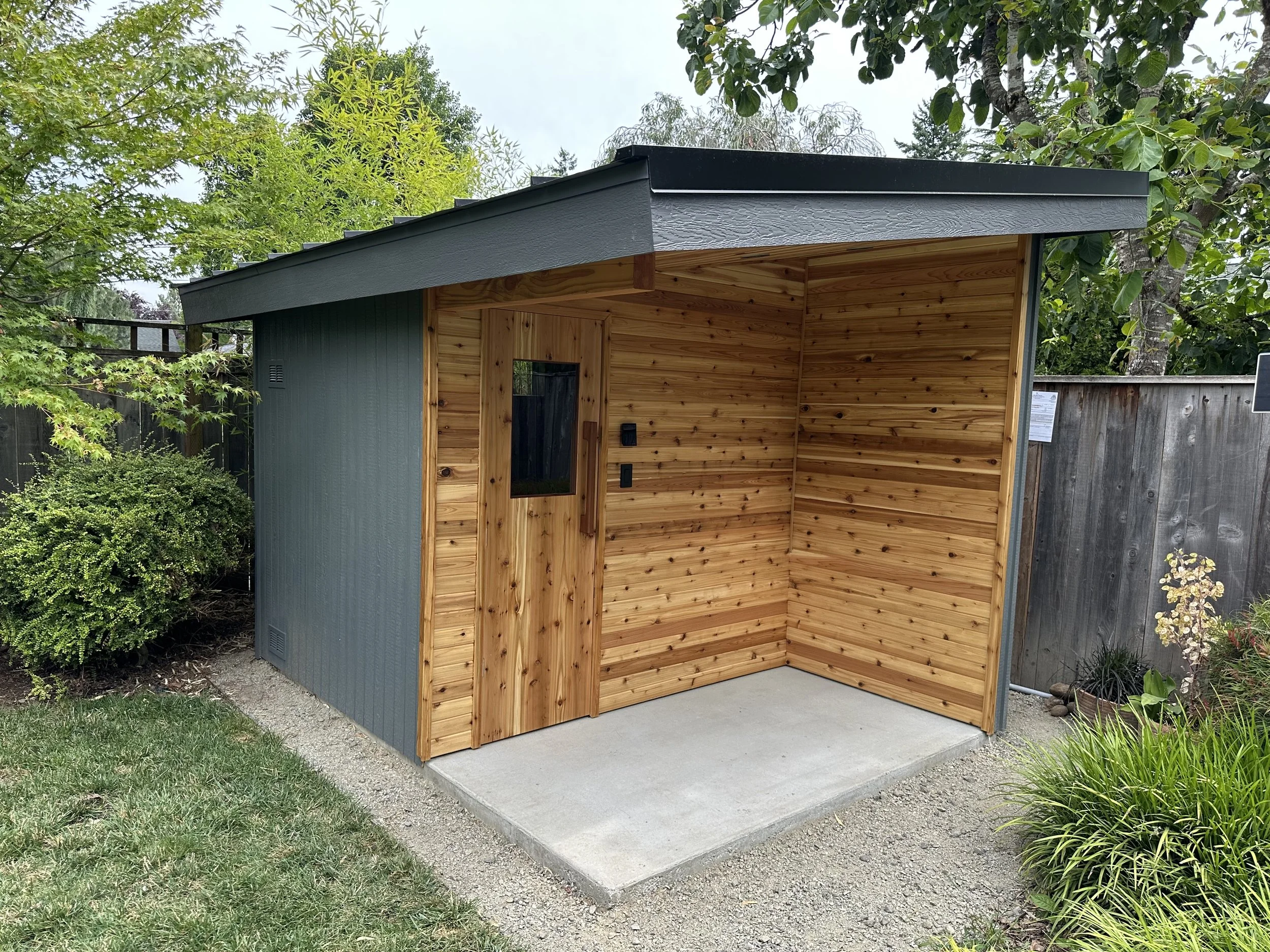 The exterior is clad in durable LP siding with a standing seam metal roof for long-term weather resistance. This backyard sauna retreat balances performance and privacy with durable construction and thoughtful detailing — a great example of what we offer as a full-service Portland sauna builder.