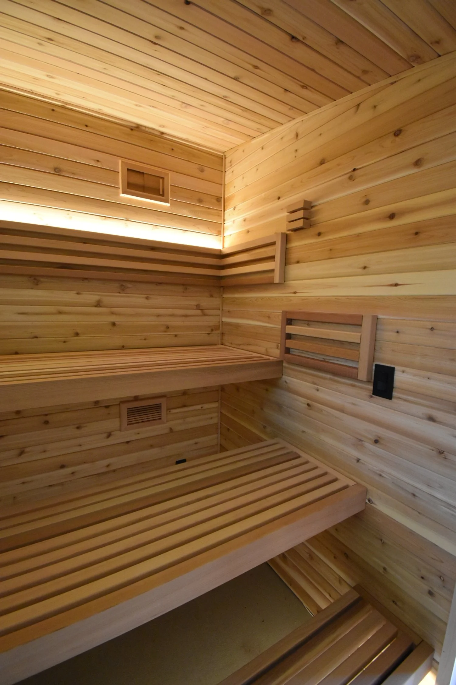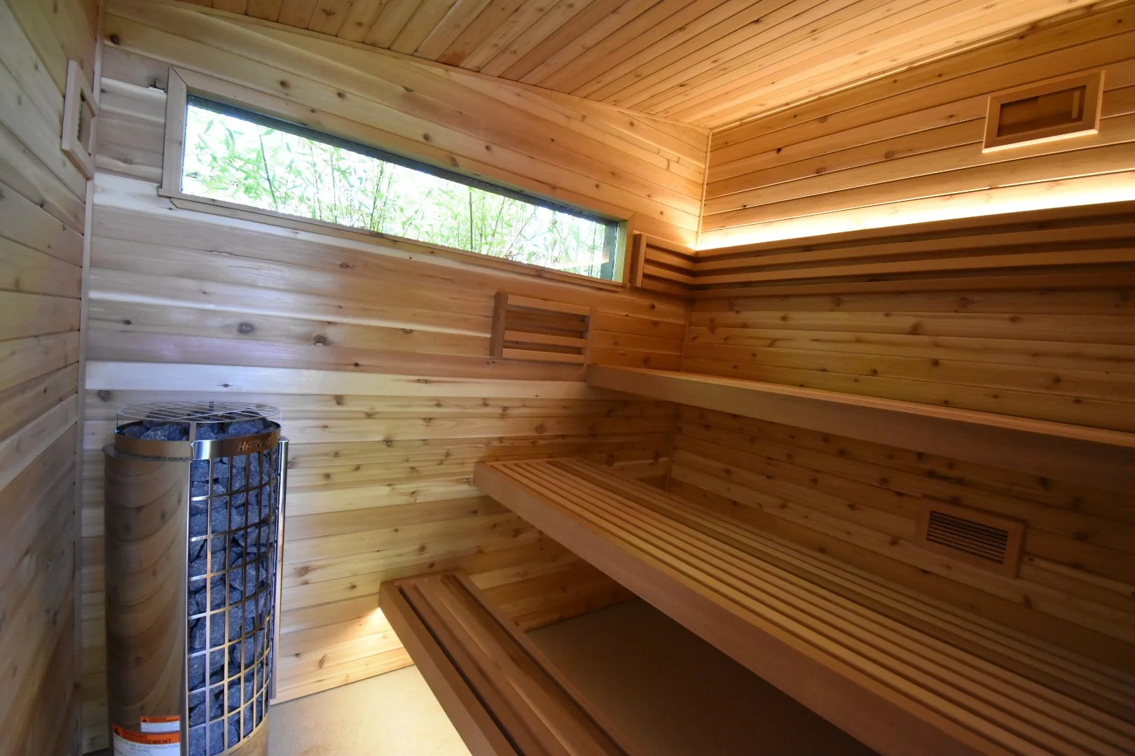 The sauna interior features premium tight knot cedar cladding, paired with floating clear cedar benches for a modern, open feel. We kept the design focused on privacy by minimizing glass and surrounding the custom door’s reduced-size window with matching tight knot cedar to maintain a cohesive, enclosed aesthetic. A small, high-placed window allows in natural light while preserving seclusion.